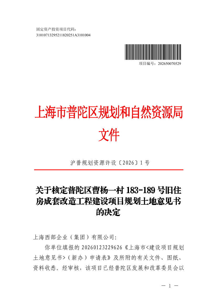 你单位填报的 20260123229626《上海市<建设项目规划土地意见书>(新办)申请表》 及所附的有关文件 、图纸 、资料收悉。 经审核,该项目已经普陀区发展和改革委员会以普发改投〔2025〕142 号和普发改投〔2026〕 3 号文批准项目建议书。 现根据《中华人民共和国土地管理法》、《中华人民共和国城乡规划法》、《自然资源部关于以 “ 多规合一 ”为基础推进规划用地“多审合一、多证合一”改革的通知》( 自然资规〔2019〕2 号 )、《上海市工程建设项目审批制度改革试点实施方案》 以及本市国土空间规划管理的有关规定, 同意核定普陀区曹杨一村 183-189 号旧住房成套改造工程建设项目规划土地意见书(编号 :沪普设(2026)CA310107202600016 ), 并告知相关管理意见如下: