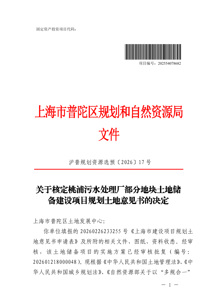 你单位填报的 20260226233255 号《上海市建设项目规划土地意见书申请表》及所附的相关文件、图纸、资料收悉。经审核,该土地储备项目的实施方案已经审核批复(编号:202601218000048 )。现根据《中华人民共和国土地管理法》、《中华人民共和国城乡规划法》、《自然资源部关于以“多规合一”为基础推进规划用地“多审合一、多证合一”改革的通知》( 自然资规〔2019〕2号 )以及本市国土空间规划管理的有关规定,同意核发桃浦污水处理厂部分地块土地储备《建设项目选址意见书》(编号:沪普书 (2026)BA310107202600166 ),并提出选址(用地预审)意见如下: