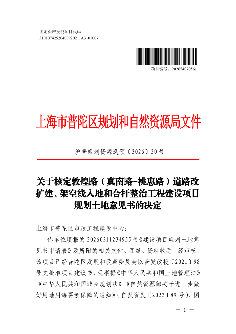 你单位填报的 20260311234955 号《建设项目规划土地意见书申请表》及所附的相关文件 、图纸、资料收悉。经审核 ,该项目已经普陀区发展和改革委员会以普发改投〔2021〕98号文批准项目建议书。现根据《中华人民共和国土地管理法》 《中华人民共和国城乡规划法》《自然资源部关于进一步做好用地用海要素保障的通知》( 自然资发〔2023〕89 号 )、国家和本市国土空间规划管理有关规定和《上海市工程建设项目审批制度改革试点实施方案》等相关要求,同意核发敦煌路(真南路-桃惠路) 道路改扩建 、 架空线入地和合杆整治工程《建设项目用地预审与选址意见书》(编号:沪普书(2026)BA310107202600209 ), 并告知相关管理意见如下: