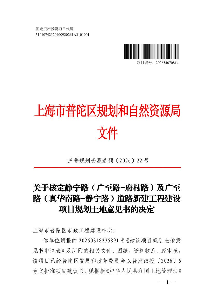 你单位填报的20260318235891号《建设项目规划土地意见书申请表》及所附的相关文件、图纸、资料收悉。经审核 ,该项目已经普陀区发展和改革委员会以普发改投〔2026〕6号文批准项目建议书。现根据《中华人民共和国土地管理法》《中华人民共和国城乡规划法》《自然资源部关于进一步做好用地用海要素保障的通知》( 自然资发〔2023〕89 号 )、国家和本市国土空间规划管理有关规定和《上海市工程建设项目审批制度改革试点实施方案》等相关要求,同意核发静宁路(广至路-府村路)及广至路(真华南路-静宁路)道路新建工程《建设项目用地预审与选址意见书》(编号:沪普书(2026)BA310107202600240 ),并告知相关管理意见如下: