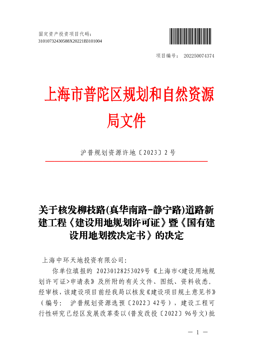 你单位填报的20230128253029号《上海市<建设用地规划许可证>申请表》及所附的有关文件、图纸、资料收悉。经审核,该建设项目前经我局以核发《建设项目规土意见书》(编号:沪普规划资源选预〔2022〕42号 ) ,建设工程可行性研究已经区发展改革委以(普发改投〔2022〕96号文)批准。现根据国家、本市国土空间规划和用途管制等有关规定,同意核发柳枝路(真华南路-静宁路)道路新建工程《建设用地规划许可证》(证号:沪普地(2023)EA310107202300077)和《国有建设用地划拨决定书》,并提出有关管理意见如下: