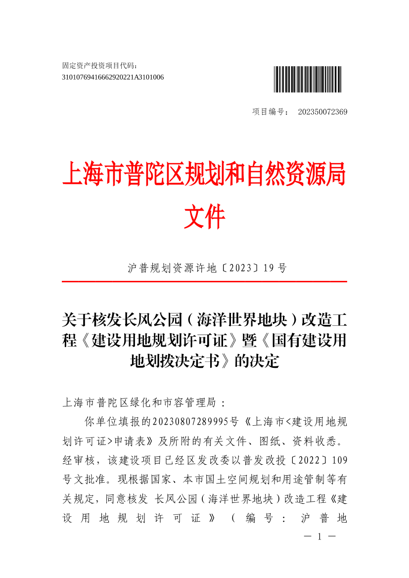 你单位填报的20230807289995号《上海市<建设用地规划许可证>申请表》及所附的有关文件、图纸、资料收悉。经审核,该建设项目已经区发改委以普发改投〔2022〕109号文批准。现根据国家、本市国土空间规划和用途管制等有关规定,同意核发长风公园(海洋世界地块)改造工程《建设用地规划许可证》(编号:沪普地(2023)EA310107202300710)和《国有建设用地划拨决定书》,并提出有关管理意见如下: