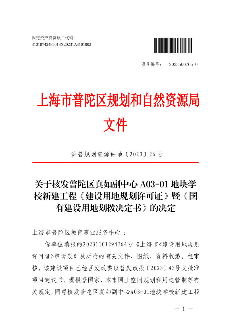 你单位填报的20231101294364号《上海市<建设用地规划许可证>申请表》及所附的有关文件、图纸、资料收悉。经审核,该建设项目已经区发改委以普发改投〔2023〕43号文批准项目建议书。现根据国家、本市国土空间规划和用途管制等有关规定,同意核发普陀区真如副中心A03-01地块学校新建工程《建设用地规划许可证》(编号:沪普地(2023)EA310107202301012)和《国有建设用地划拨决定书》,