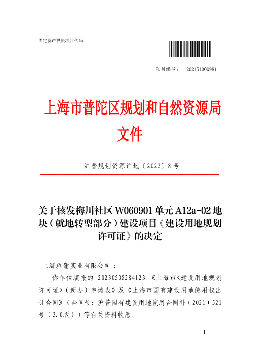 沪普规划资源许地〔2023〕8号