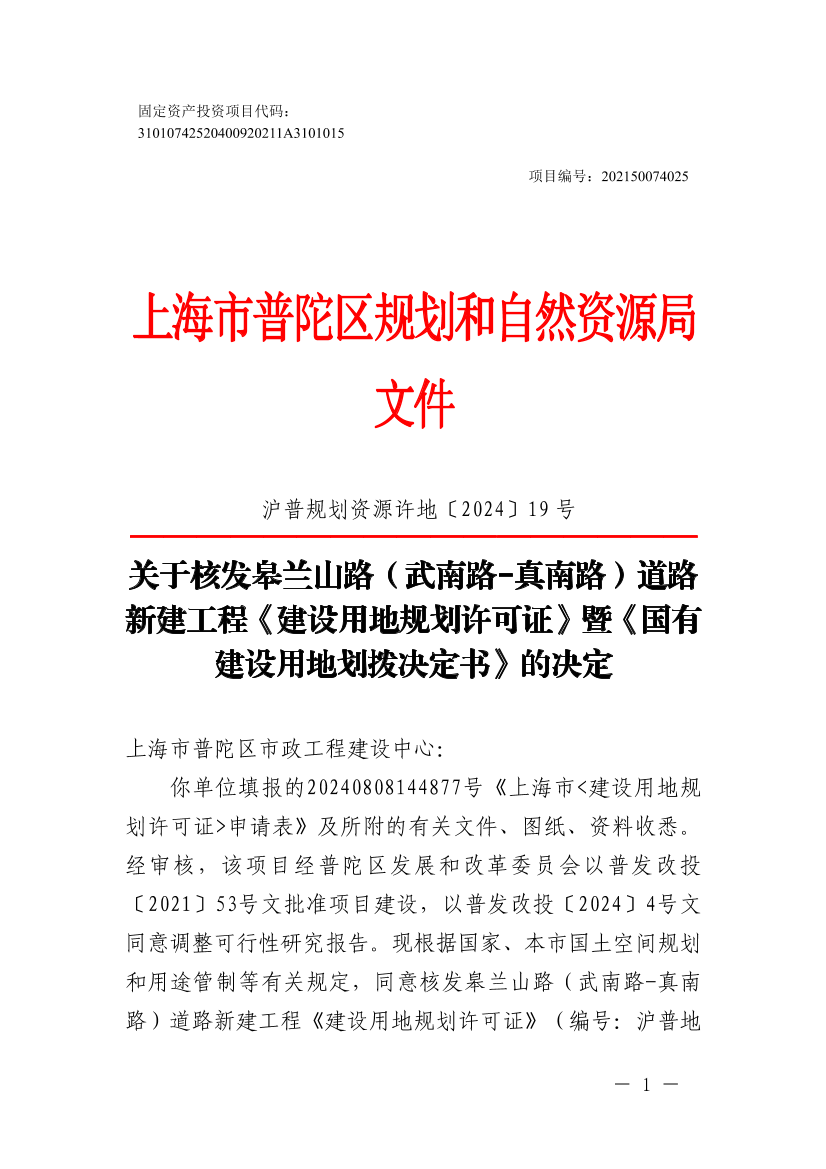 你单位填报的20240808144877号《上海市<建设用地规划许可证>申请表》及所附的有关文件、图纸、资料收悉。经审核,该项目经普陀区发展和改革委员会以普发改投〔2021 〕53号文批准项目建设,以普发改投〔2024〕4号文同意调整可行性研究报告。现根据国家、本市国土空间规划和用途管制等有关规定,同意核发皋兰山路(武南路-真南路)道路新建工程《建设用地规划许可证》(编号:沪普地(2024)EA310107202400653)和《国有建设用地划拨决定书》,并提出有关管理意见如下: