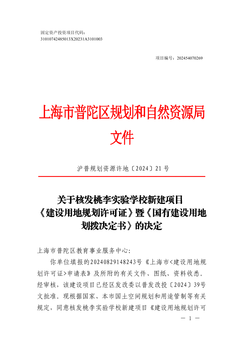 你单位填报的20240829148243号《上海市<建设用地规划许可证>申请表》及所附的有关文件、图纸、资料收悉。经审核,该建设项目已经区发改委以普发改投〔2024〕39号文批准。现根据国家、本市国土空间规划和用途管制等有关规定,同意核发桃李实验学校新建项目《建设用地规划许可证》(编号:沪普地(2024)EA310107202400698)和《国有建设用地划拨决定书》,并提出有关管理意见如下: