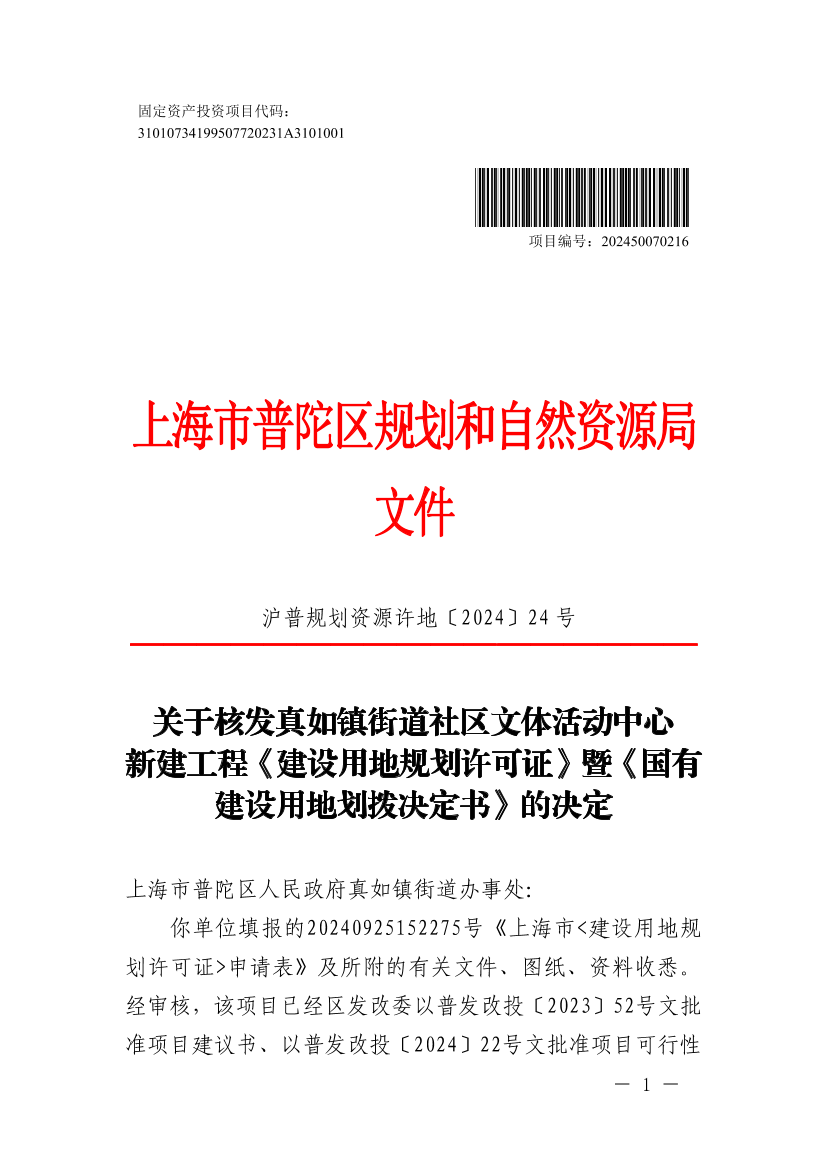 经审核,该项目已经区发改委以普发改投〔2023〕52号文批准项目建议书、以普发改投〔2024〕22号文批准项目可行性研究报告。现根据国家、本市国土空间规划和用途管制等有关规定,同意核发真如镇街道社区文体活动中心新建工程《 建 设 用 地 规 划 许 可 证 》 ( 编 号 : 沪 普 地 (2024)EA310107202400782 )和《国有建设用地划拨决定书》,并提出有关管理意见如下: