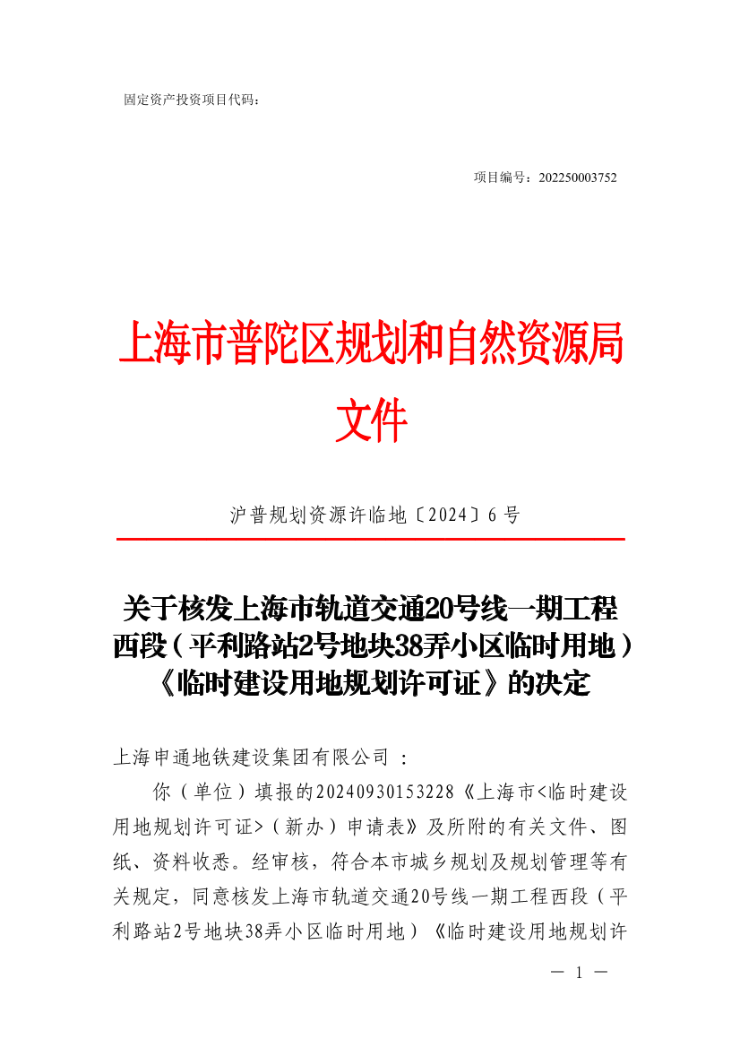 你(单位)填报的20240930153228《上海市<临时建设用地规划许可证>(新办)申请表》及所附的有关文件、图纸、资料收悉。经审核,符合本市城乡规划及规划管理等有关规定,同意核发上海市轨道交通20号线一期工程西段(平利路站2号地块38弄小区临时用地)《临时建设用地规划许可证》(编号:沪普地临(2024)EB310107202400127),并提出有关管理要求如下: