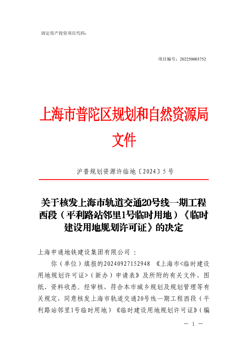 你(单位)填报的20240927152948《上海市<临时建设用地规划许可证>(新办)申请表》及所附的有关文件、图纸、资料收悉。经审核,符合本市城乡规划及规划管理等有关规定,同意核发上海市轨道交通20号线一期工程西段(平利路站邻里1号临时用地)《临时建设用地规划许可证》(编号:沪普地临(2024)EB310107202400126),并提出有关管理要求如下: