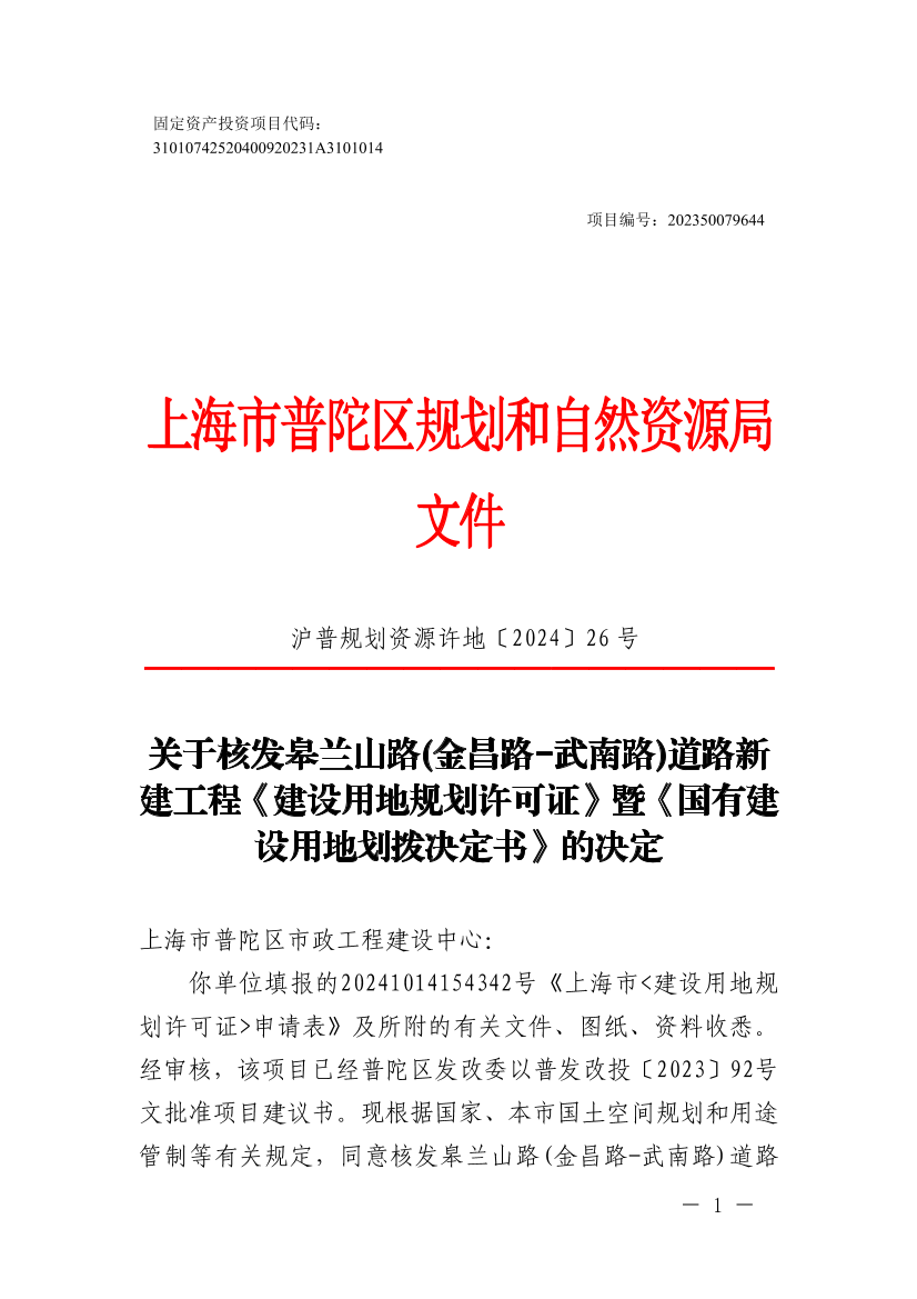你单位填报的20241014154342号《上海市<建设用地规划许可证>申请表》及所附的有关文件、图纸、资料收悉。经审核,该项目已经普陀区发改委以普发改投〔2023〕92号文批准项目建议书。现根据国家、本市国土空间规划和用途管制等有关规定,同意核发皋兰山路(金昌路-武南路)道路新建工程《建设用地规划许可证》(编号:沪普地(2024)EA310107202400839)和《国有建设用地划拨决定书》,并提出有关管理意见如下: