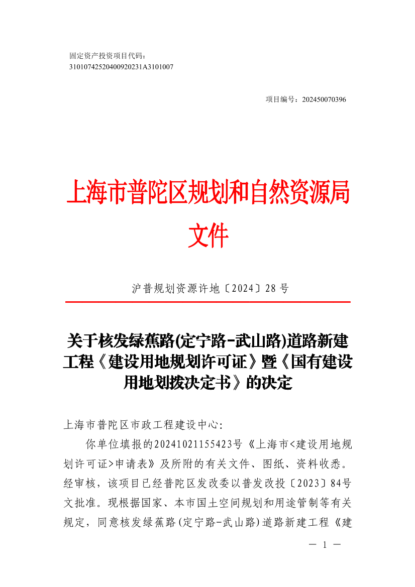 你单位填报的20241021155423号《上海市<建设用地规划许可证>申请表》及所附的有关文件、图纸、资料收悉。经审核,该项目已经普陀区发改委以普发改投〔2023〕84号文批准。现根据国家、本市国土空间规划和用途管制等有关规定,同意核发绿蕉路(定宁路-武山路)道路新建工程《建设用地规划许可证》(编号:沪普地(2024)EA310107202400856)和《国有建设用地划拨决定书》,并提出有关管理意见如下: