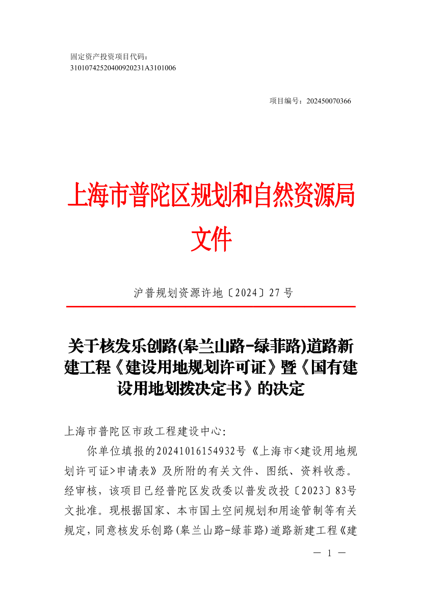 你单位填报的20241016154932号《上海市<建设用地规划许可证>申请表》及所附的有关文件、图纸、资料收悉。经审核,该项目已经普陀区发改委以普发改投〔2023〕83号文批准。现根据国家、本市国土空间规划和用途管制等有关规定,同意核发乐创路(皋兰山路-绿菲路)道路新建工程《建设用地规划许可证》(编号:沪普地(2024)EA310107202400855)和《国有建设用地划拨决定书》,并提出有关管理意见如下: