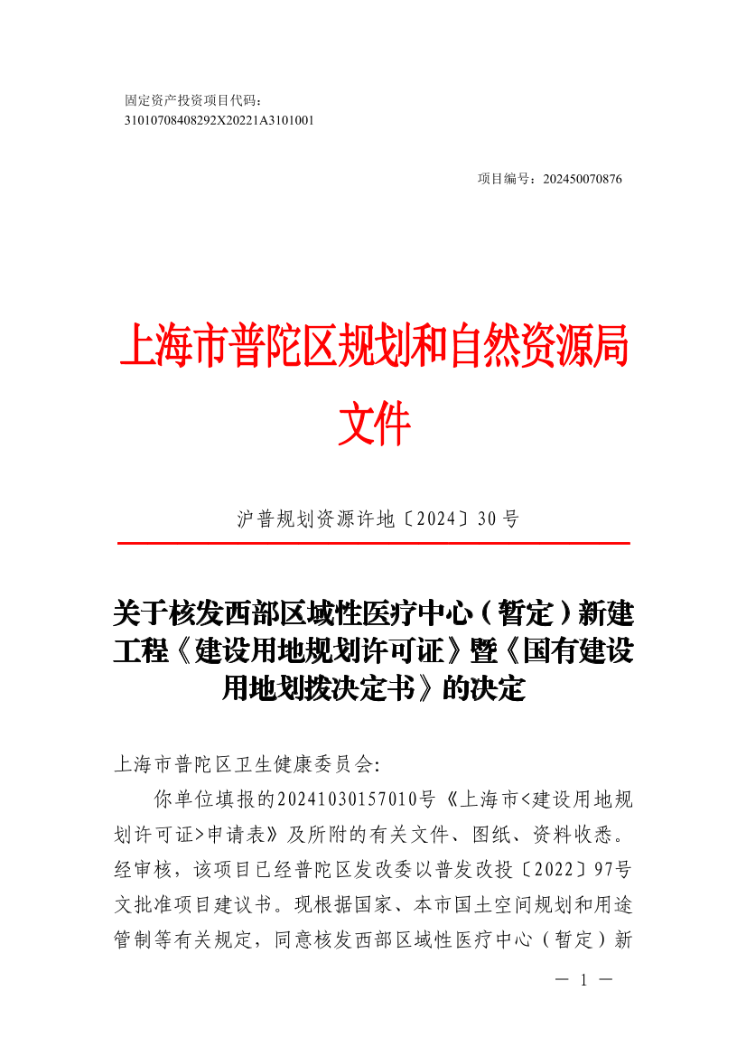 你单位填报的20241030157010号《上海市<建设用地规划许可证>申请表》及所附的有关文件、图纸、资料收悉。经审核,该项目已经普陀区发改委以普发改投〔2022〕97号文批准项目建议书。现根据国家、本市国土空间规划和用途管制等有关规定,同意核发西部区域性医疗中心(暂定)新建工程《建设用地规划许可证》(编号:沪普地(2024)EA310107202400886)和《国有建设用地划拨决定书》,并提出有关管理意见如下: