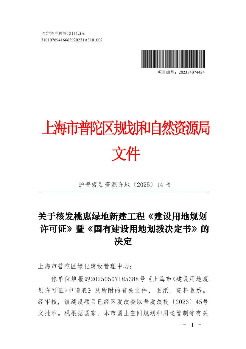你单位填报的20250507185388号《上海市<建设用地规划许可证>申请表》及所附的有关文件、图纸、资料收悉。经审核,该建设项目已经区发改委以普发改投〔2023〕45号文批准。现根据国家、本市国土空间规划和用途管制等有关规定,同意核发桃惠绿地新建工程《建设用地规划许可证》(编号:沪普地(2025)EA310107202500330)和《国有建设用地划拨决定书》,并提出有关管理意见如下: