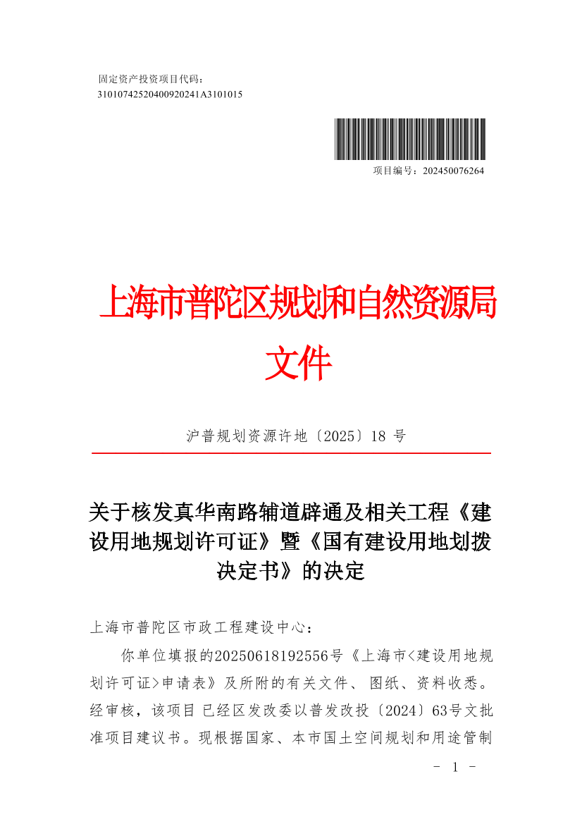 你单位填报的20250618192556号《上海市<建设用地规划许可证>申请表》及所附的有关文件、图纸、资料收悉。经审核,该项目已经区发改委以普发改投〔2024〕63号文批准项目建议书。现根据国家、本市国土空间规划和用途管制等有关规定,同意核发真华南路辅道辟通及相关工程《建设用地规划许可证》(编号:沪普地(2025)EA310107202500428)和《国有建设用地划拨决定书》,并提出有关管理意见如下: