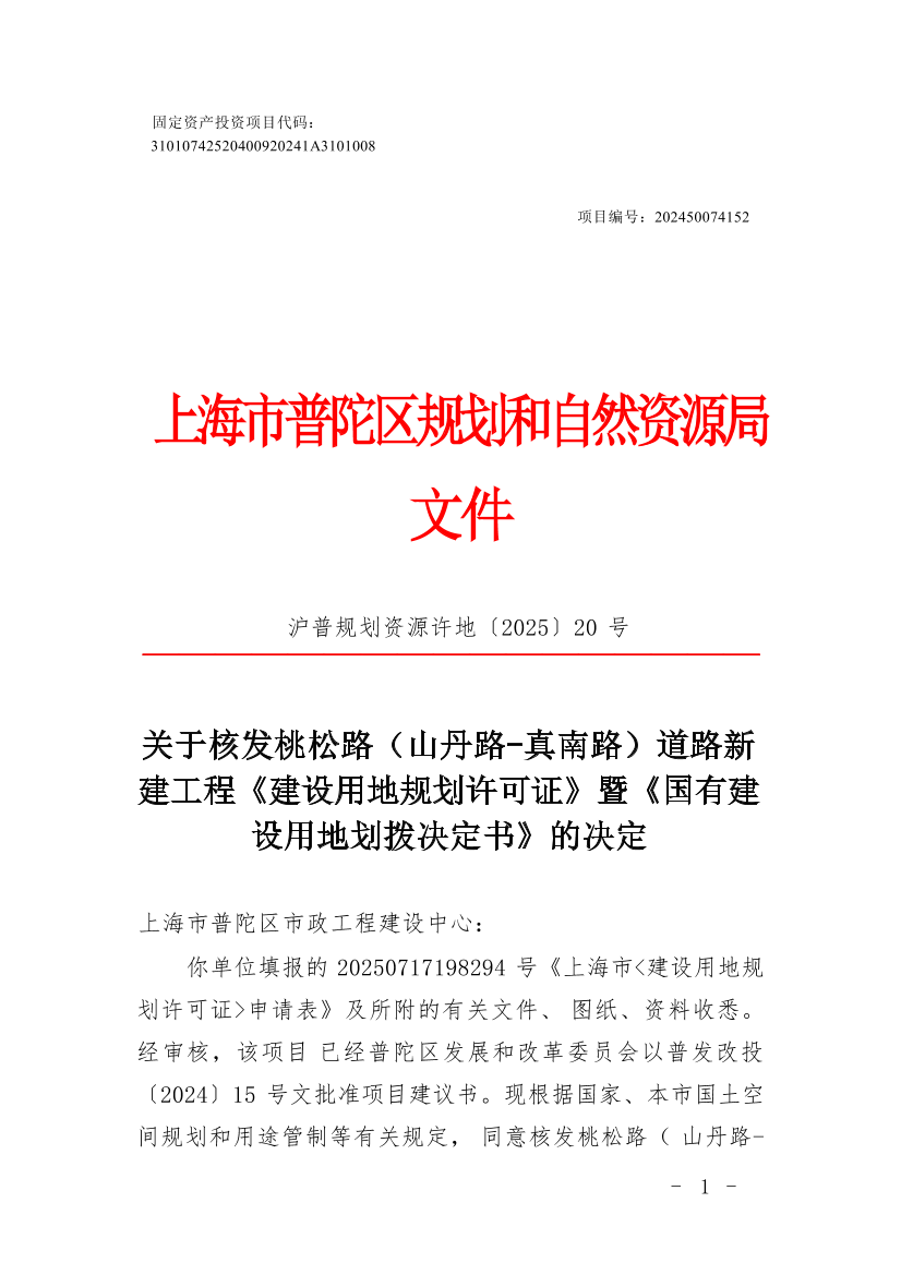 你单位填报的20250717198294号《上海市<建设用地规划许可证>申请表》及所附的有关文件、图纸、资料收悉。经审核,该项目已经普陀区发展和改革委员会以普发改投〔2024〕15号文批准项目建议书。现根据国家、本市国土空间规划和用途管制等有关规定,同意核发桃松路(山丹路-真南路)道路新建工程《建设用地规划许可证》(编号:沪普地(2025)EA310107202500516)和《国有建设用地划拨决定书》,并提出有关管理意见如下: