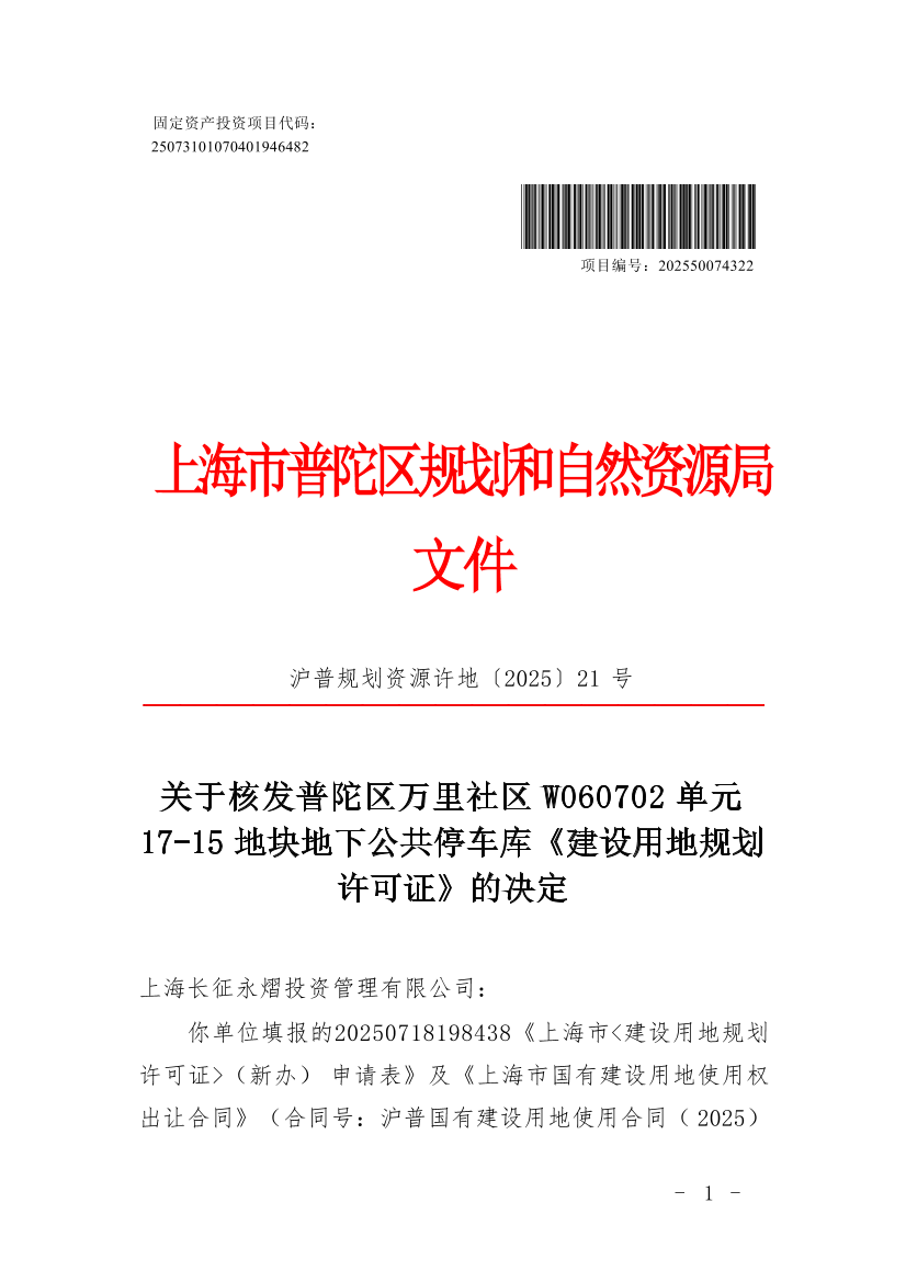 经审核,符合《中华人民共和国土地管理法》、《中华人民共和国城乡规划法》、《上海市城乡规划条例》和本市国土空间规划管理的有关规定。根据《中华人民共和国行政许可法》的有关规定,准予核发普陀区万里社区W060702单元17-15地块地下公共停车库《建设用地规划许可证》(编号: 沪普地(2025)EA310107202500517 ),国土空间规划及用途管制要求按合同相关条款的规定执行。