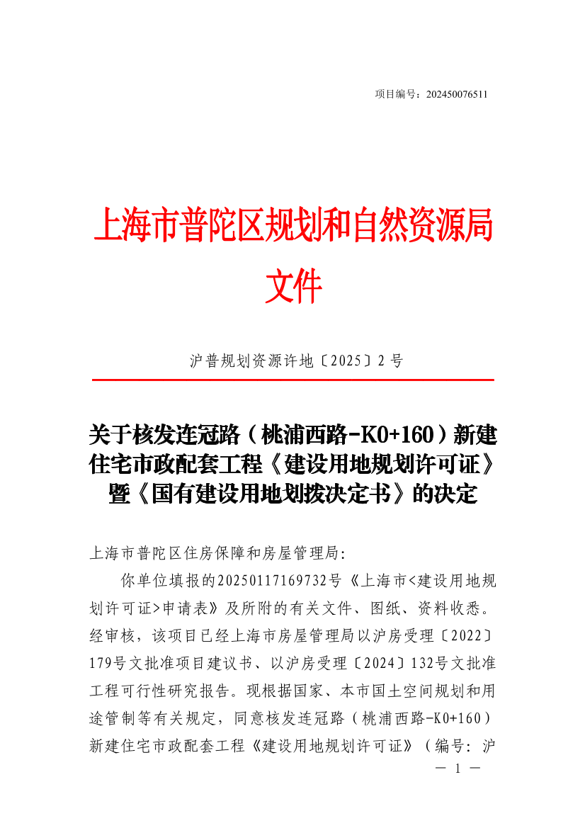 你单位填报的20250117169732号《上海市<建设用地规划许可证>申请表》及所附的有关文件、图纸、资料收悉。经审核,该项目已经上海市房屋管理局以沪房受理〔2022〕179号文批准项目建议书、以沪房受理〔2024〕132号文批准工程可行性研究报告。现根据国家、本市国土空间规划和用途管制等有关规定,同意核发连冠路(桃浦西路-K0+160)新建住宅市政配套工程《建设用地规划许可证》(编号:沪普地(2025)EA310107202500056)和《国有建设用地划拨决定书》,并提出有关管理意见如下: