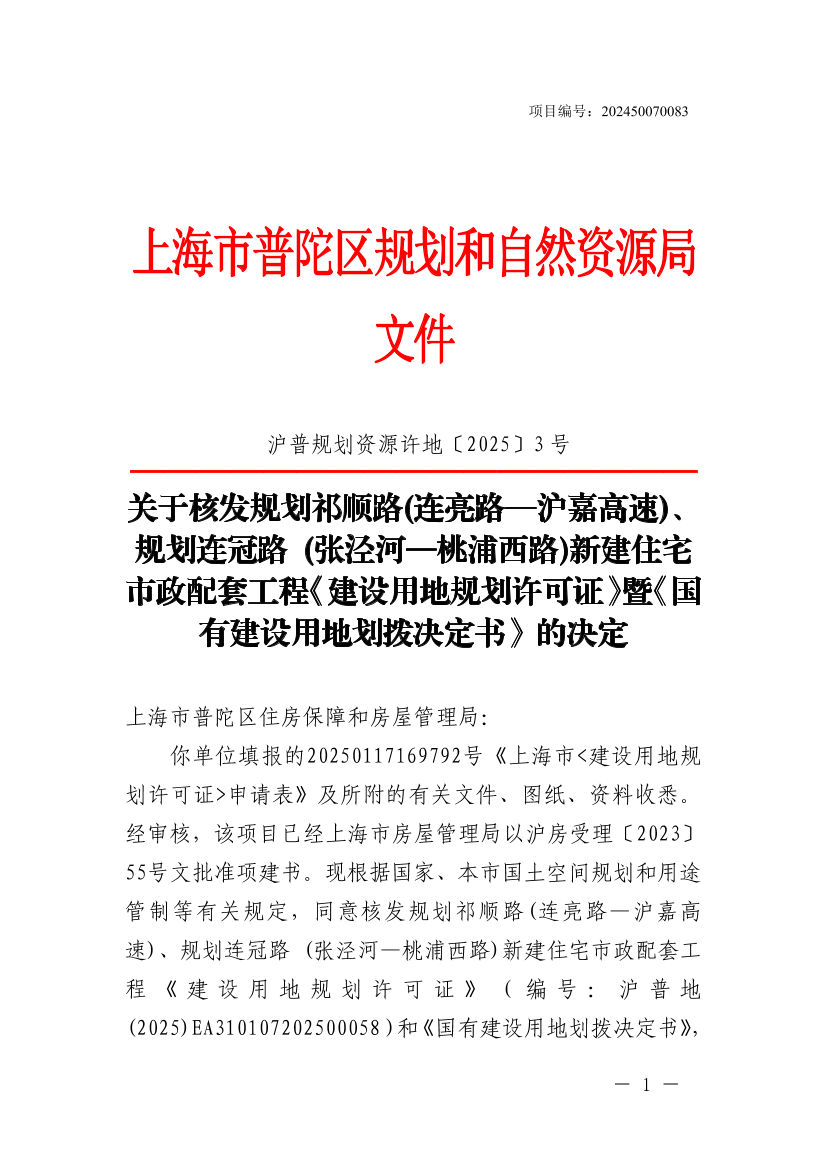 你单位填报的20250117169792号《上海市<建设用地规划许可证>申请表》及所附的有关文件、图纸、资料收悉。经审核,该项目已经上海市房屋管理局以沪房受理〔2023〕55号文批准项建书。现根据国家、本市国土空间规划和用途管制等有关规定,同意核发规划祁顺路(连亮路—沪嘉高速)、规划连冠路(张泾河—桃浦西路)新建住宅市政配套工程《建设用地规划许可证》(编号:沪普地(2025)EA310107202500058)和《国有建设用地划拨决定书》,并提出有关管理意见如下: