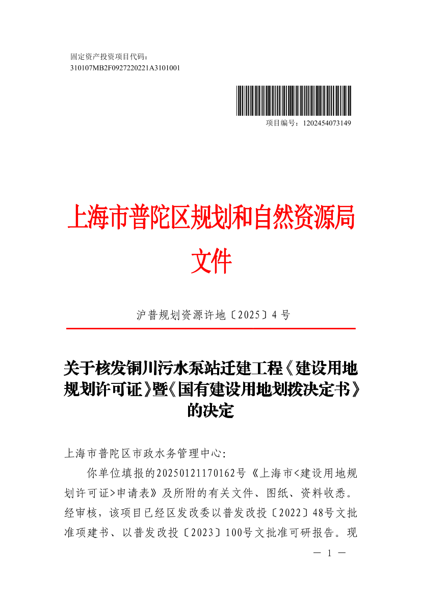 你单位填报的20250121170162号《上海市<建设用地规划许可证>申请表》及所附的有关文件、图纸、资料收悉。经审核,该项目已经区发改委以普发改投〔2022〕48号文批准项建书、以普发改投〔2023〕100号文批准可研报告。现根据国家、本市国土空间规划和用途管制等有关规定,同意核发铜川污水泵站迁建工程《建设用地规划许可证》(编号:沪普地(2025)EA310107202500061)和《国有建设用地划拨决定书》,并提出有关管理意见如下: