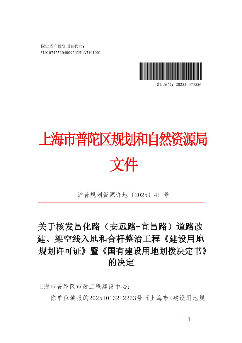 你单位填报的20251013212233号《上海市<建设用地规划许可证>申请表》及所附的有关文件、图纸、资料收悉。经审核,该建设项目已经区发改委以普发改投〔2025〕1号文批准项目建议书,并经我局以沪普规划资源选预〔2025〕26号文核发《建设项目规划土地意见书》 (编号:沪普书(2025)BA310107202500600)。现根据国家、本市国土空间规划和用途管制等有关规定,同意核发昌化路(安远路-宜昌路)道路改建、架空线入地和合杆整治工程《建设用地规划许可证》(编号:沪普地(2025)EA310107202500784)和《国有建设用地划拨决定书》,并提出有关管理意见如下: