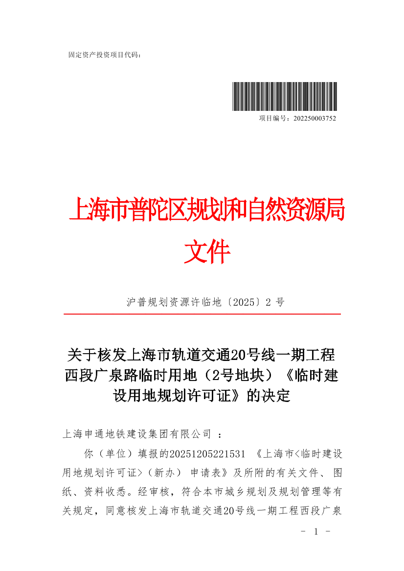 你(单位)填报的20251205221531 《上海市<临时建设用地规划许可证>(新办)申请表》及所附的有关文件、图纸、资料收悉。经审核,符合本市城乡规划及规划管理等有关规定,同意核发上海市轨道交通20号线一期工程西段广泉路临时用地(2号地块)《临时建设用地规划许可证》(编号:沪普地临(2025)EB310107202500082),并提出有关管理要求如下: