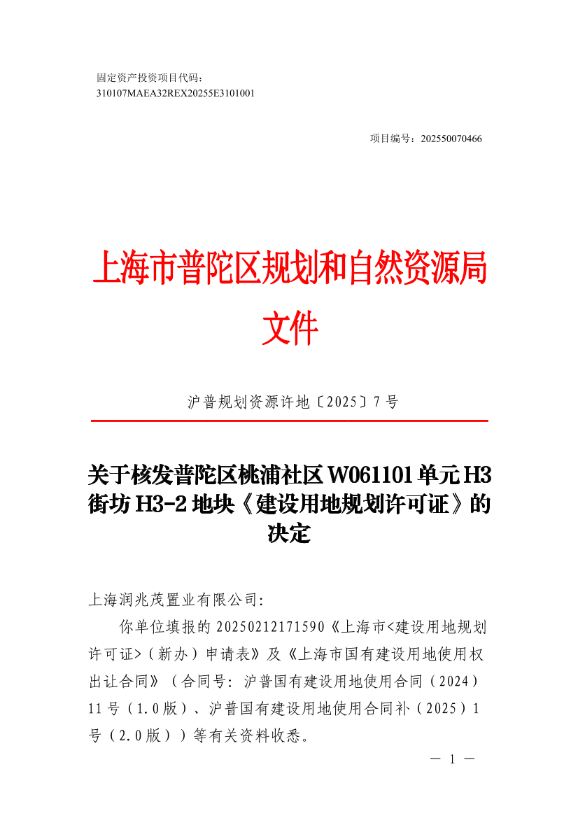 经审核,符合《中华人民共和国土地管理法》、《中华人民共和国城乡规划法》、《上海市城乡规划条例》和本市国土空间规划管理的有关规定。根据《中华人民共和国行政许可法》的有关规定,准予核发普陀区桃浦社区W061101单元H3街坊H3-2地块《建设用地规划许可证》(编号:沪普地(2025)EA310107202500092),国土空间规划及用途管制要求按合同相关条款的规定执行。