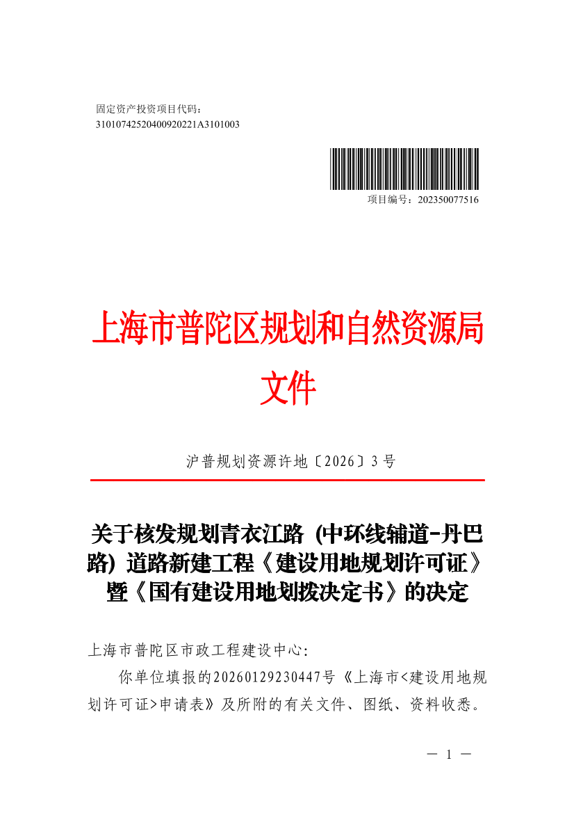 经审核,该建设项目已经区发改委以普发改投〔2022〕11号文批准。现根据国家 、本市国土空间规划和用途管制等有关规定,同意核发规划青衣江路 (中环线辅道-丹巴路) 道路新建工程《建设用地规划许可证》(编号:沪普地(2026)EA310107202600078)和《国有建设用地划拨决定书》,并提出有关管理意见如下: