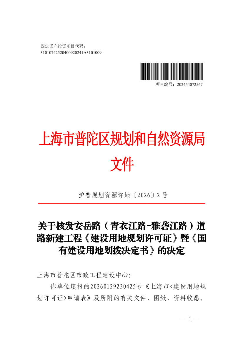经审核,该建设项目已经区发改委以普发改投〔2024〕28号文批准。现根据国家 、本市国土空间规划和用途管制等有关规定,同意核发安岳路(青衣江路-雅砻江路)道路新建工程《建设用地规划许可证》(编号:沪普地(2026)EA310107202600074)和《国有建设用地划拨决定书》,并提出有关管理意见如下: