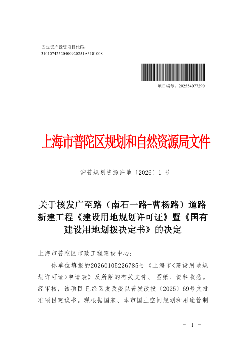 你单位填报的20260105226785号《上海市<建设用地规划许可证>申请表》及所附的有关文件、图纸、资料收悉。经审核,该项目已经区发改委以普发改投〔2025〕69号文批准项目建议书。现根据国家、本市国土空间规划和用途管制等有关规定, 同意核发广至路(南石一路-曹杨路)道路新建工程《建设用地规划许可证》(编号:沪普地(2026)EA310107202600026)和《国有建设用地划拨决定书》,并提出有关管理意见如下: