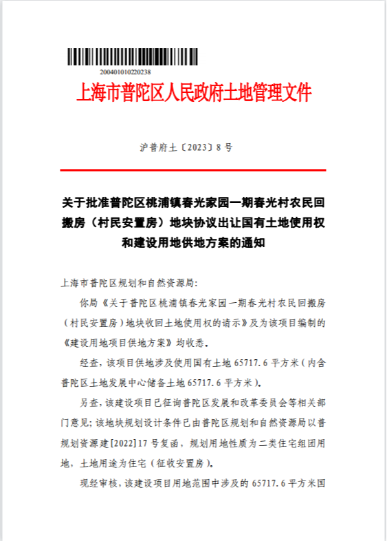 关于批准普陀区桃浦镇春光家园一期春光村农民回搬房(村民安置房)地块协议出让国有土地使用权和建设用地供地方案的通知