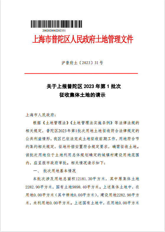 关于上报普陀区2023年第1批次征收集体土地的请示