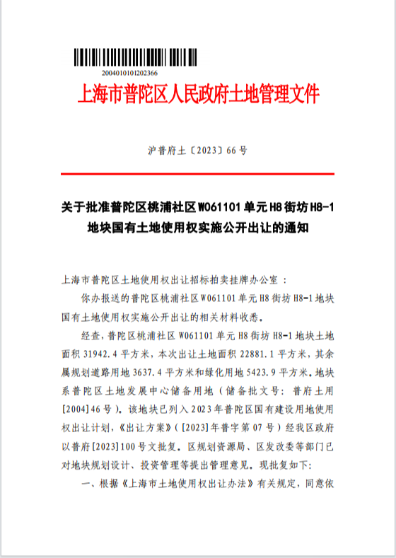 关于批准普陀区桃浦社区W061101单元H8街坊H8-1地块国有土地使用权实施公开出让的通知