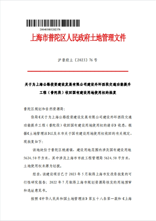 你局《关于为上海公路投资建设发展有限公司建设外环西段交通功能提升工程(普陀段)收回国有建设用地使用权的请示》收悉,根据《土地管理法》以及本市关于国有建设用地使用权收回的有关规定,现批复如下: