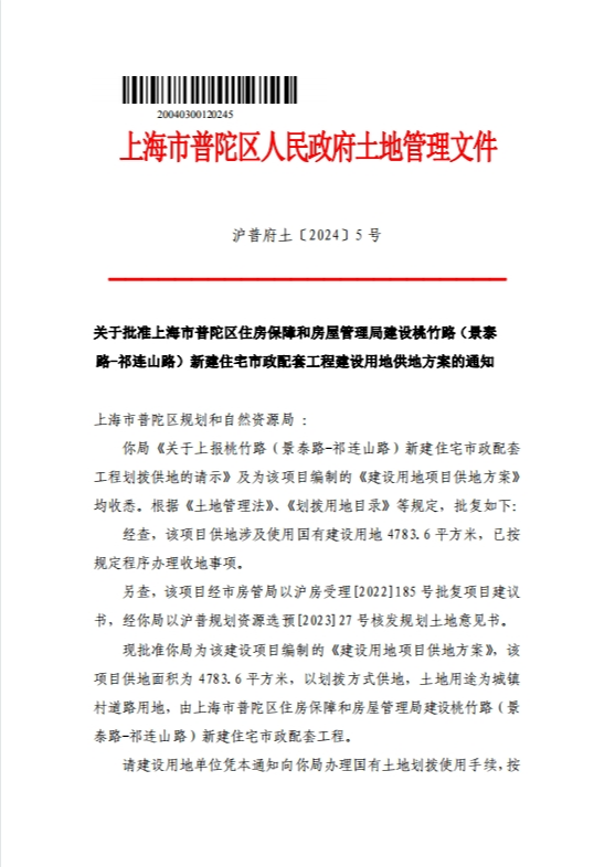 现批准你局为该建设项目编制的《建设用地项目供地方案》,该项目供地面积为4783.6平方米,以划拨方式供地,土地用途为城镇村道路用地,由上海市普陀区住房保障和房屋管理局建设桃竹路(景泰路-祁连山路)新建住宅市政配套工程。