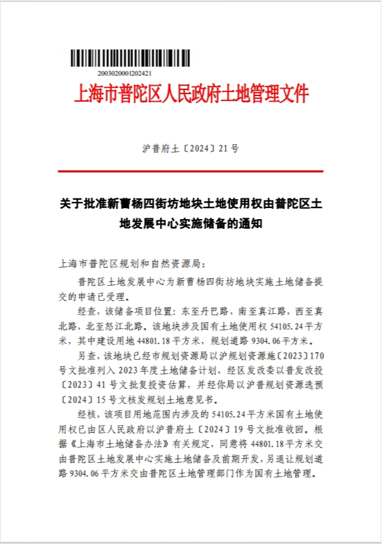 关于批准新曹杨四街坊地块土地使用权由普陀区土地发展中心实施储备的通知