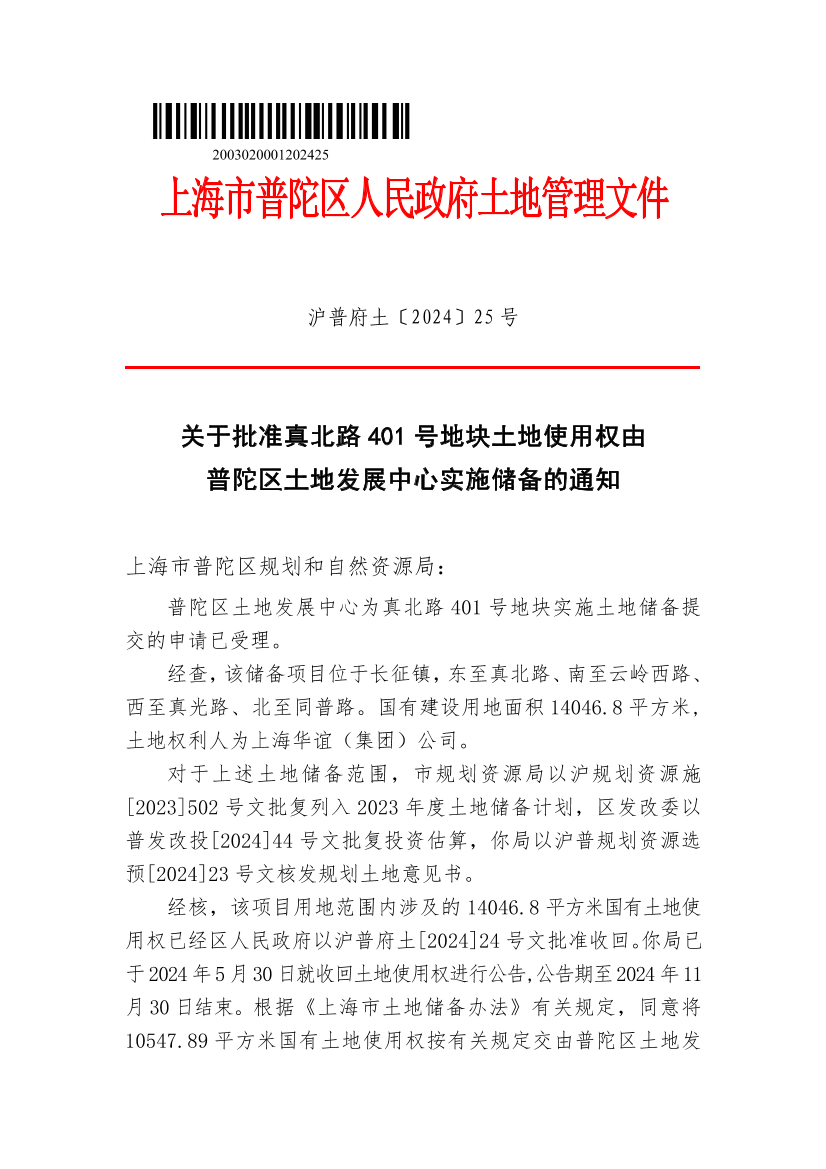关于批准真北路401号地块土地使用权由普陀区土地发展中心实施储备的通知