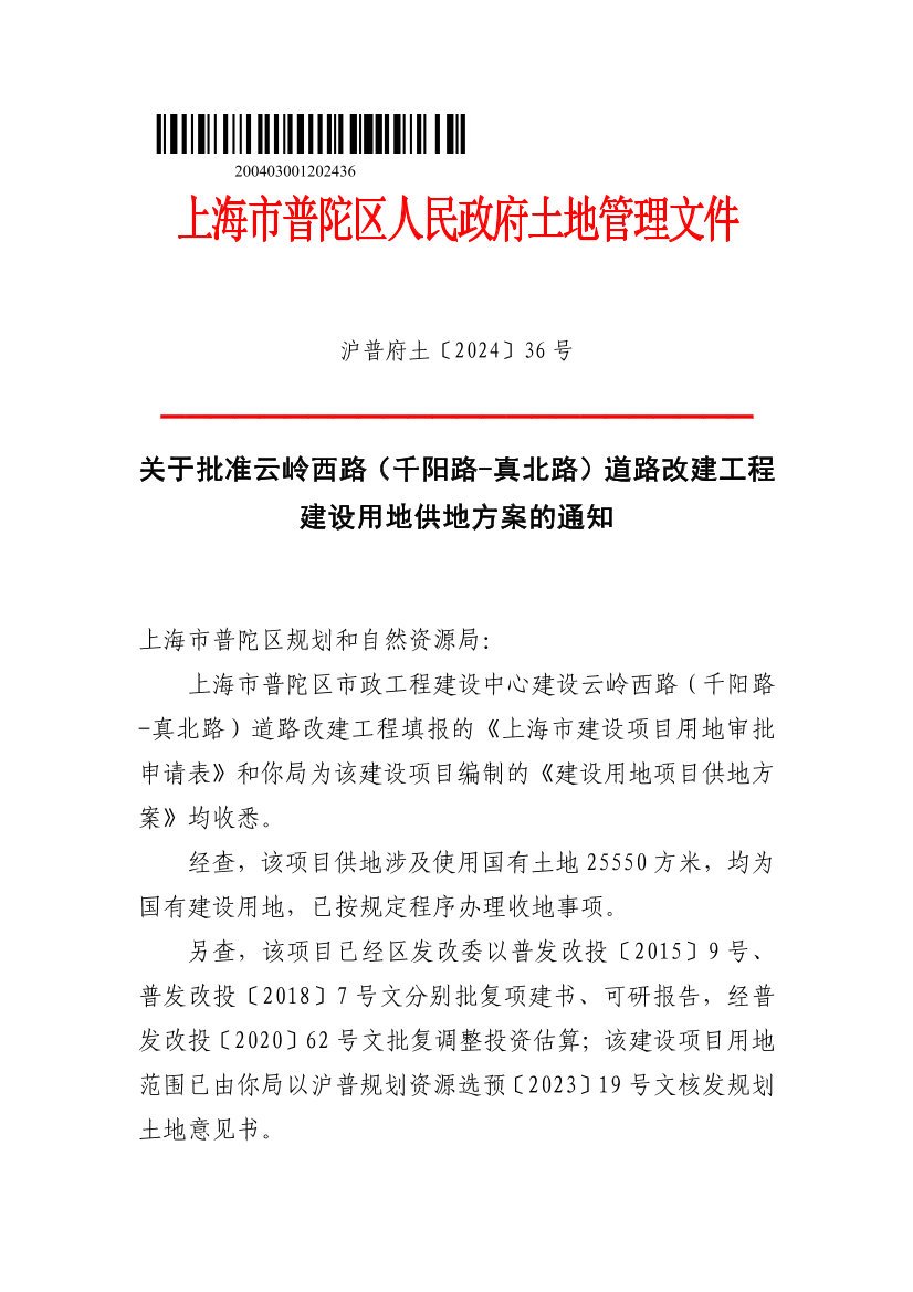 关于批准云岭西路(千阳路-真北路)道路改建工程建设用地供地方案的通知