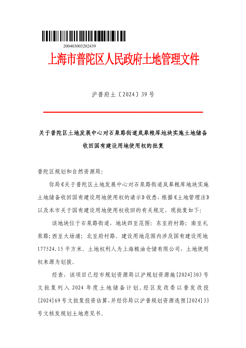 关于普陀区土地发展中心对石泉路街道岚皋粮库地块实施土地储备收回国有建设用地使用权的批复