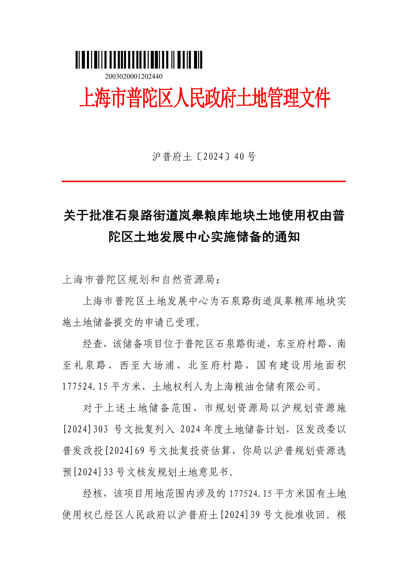 经核,该项目用地范围内涉及的177524.15平方米国有土地使用权已经区人民政府以沪普府土[2024]39号文批准收回。根据《上海市土地储备办法》有关规定,同意将上述177524.15平方米土地交由上海市普陀区土地发展中心实施土地储备及前期开发。