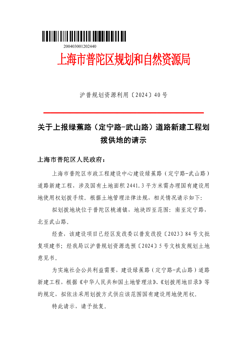 批准你局为该建设项目编制的《建设用地项目供地方案》,该项目供地面积为2441.3平方米,由上海市普陀区市政工程建设中心建设绿蕉路(定宁路-武山路)道路新建工程,以划拨方式供地,土地用途为城镇村道路用地。