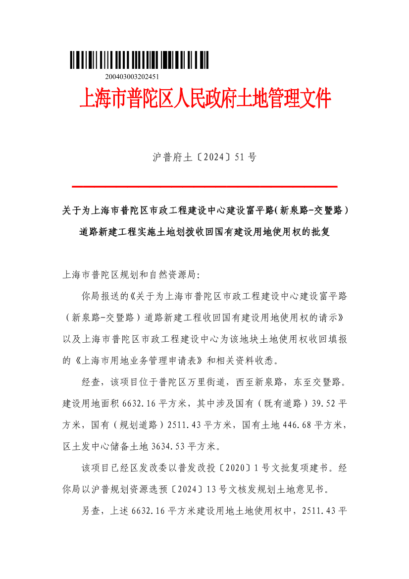 另查,上述6632.16平方米建设用地土地使用权中,2511.43平方米国有(规划道路)已经沪普府土〔2017〕40号、沪普府土〔2023〕46号、沪普府土〔2017〕39号、普府土用〔1998〕148号收回国有;3634.53平方米区土发中心储备土地已经沪普府土〔2013〕7号、沪普府土〔2022〕52号、沪普府土〔2023〕17号收回国有。本次涉及收回其余486.2平方米国有土地使用权。