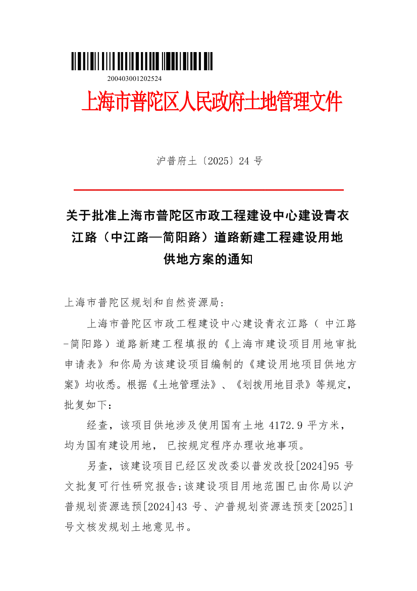 现批准你局为该建设项目编制的《建设用地项目供地方案》,该项目供地面积为4172.9平方米,由上海市普陀区市政工程建设中心建设青衣江路(中江路-简阳路)道路新建工程,以划拨方式供地,土地用途为城镇村道路用地。