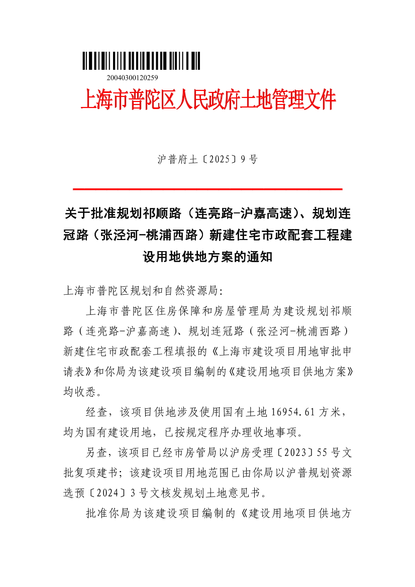 批准你局为该建设项目编制的《建设用地项目供地方案》,该项目供地面积为16954.61平方米(其中776.6平方米为地上空间),由上海市普陀区住房保障和房屋管理局建设规划祁顺路(连亮路-沪嘉高速)、规划连冠路(张泾河-桃浦西路)新建住宅市政配套工程,以划拨方式供地,土地用途为城镇村道路用地。
