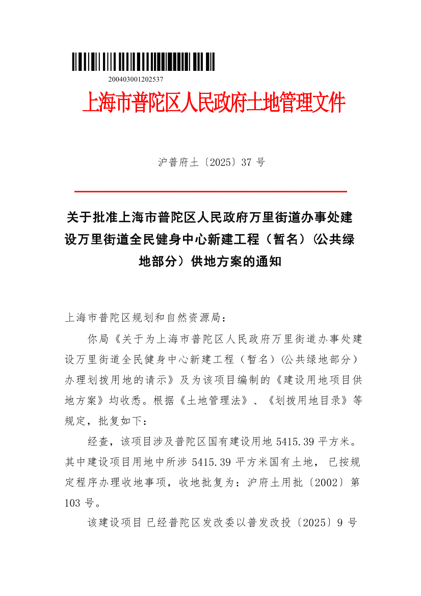 现批准你局为该建设项目编制的《建设项目用地供地方案》,该项目供地面积5415.39为平方米,以划拨方式供地,土地用途为公园与绿地,由上海市普陀区人民政府万里街道办事处建设万里街道全民健身中心新建工程(暂名)(公共绿地部分)工程。