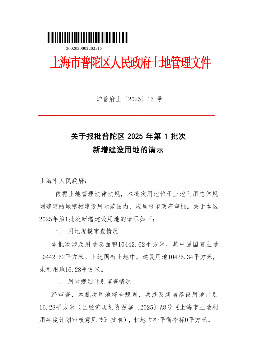 经审查,本批次用地符合规划,共涉及新增建设用地计划16.28平方米(已经沪规划资源施〔2025〕A8号《上海市土地利 用年度计划审核意见书》批准),耕地占补平衡指标0平方米。