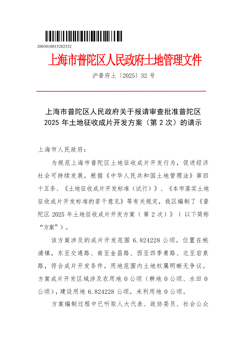 上海市普陀区人民政府关于报请审查批准普陀区2025年土地征收成片开发方案(第2次)的请示