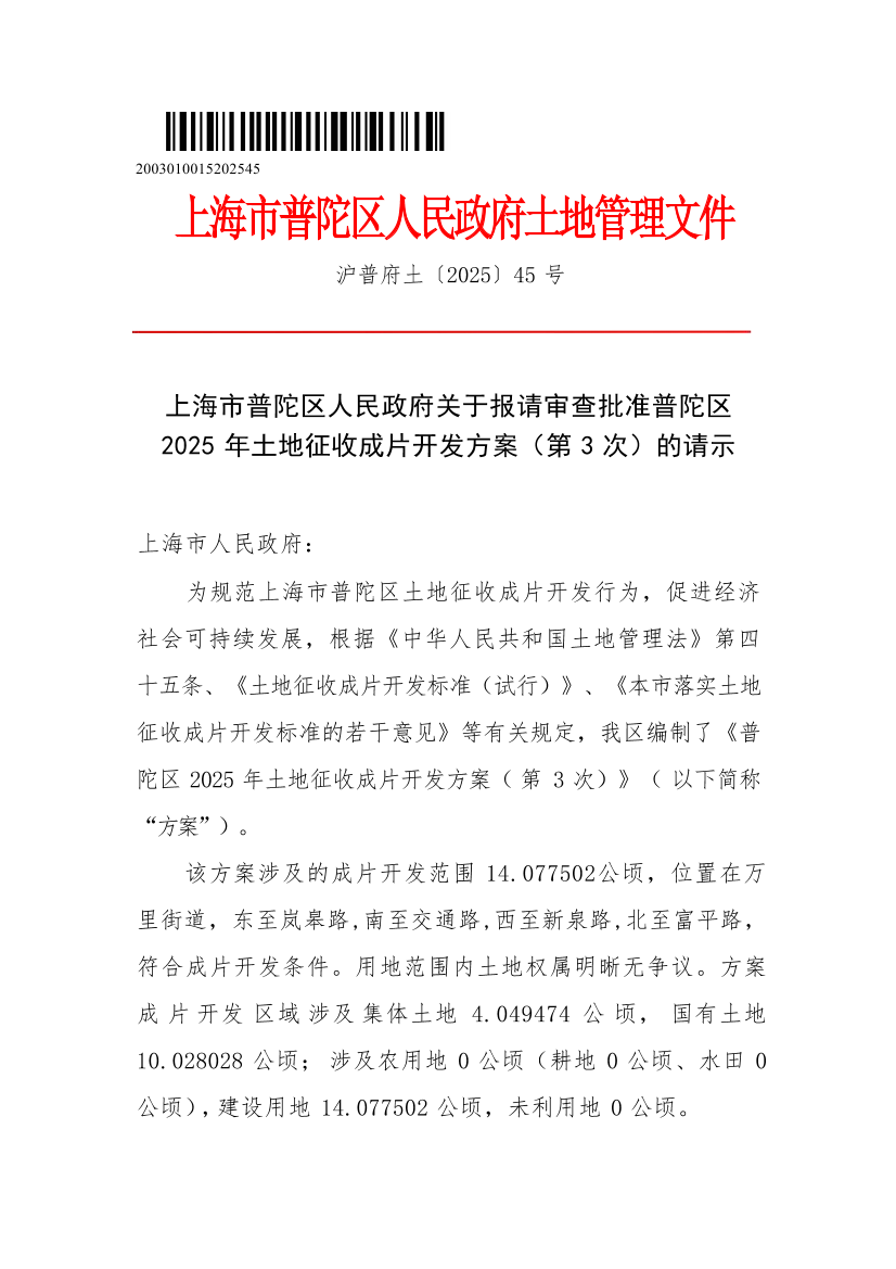 上海市普陀区人民政府关于报请审查批准普陀区2025年土地征收成片开发方案(第3次)的请示