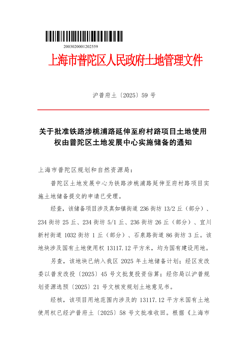 关于批准铁路涉桃浦路延伸至府村路项目土地使用权由普陀区土地发展中心实施储备的通知