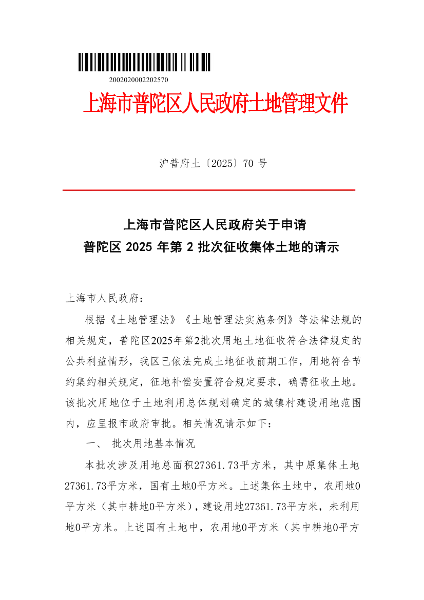 上海市普陀区人民政府关于申请普陀区2025年第2批次征收集体土地的请示